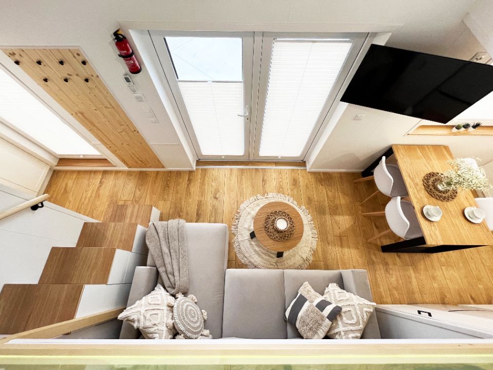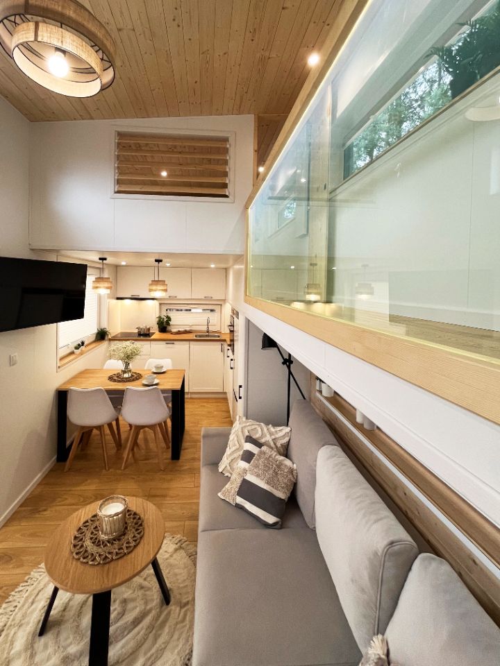 De plus, le canapé offre un couchage spacieux et confortable pour les invités, permettant ainsi d’accueillir jusqu’à six personnes dans la Tiny House River.